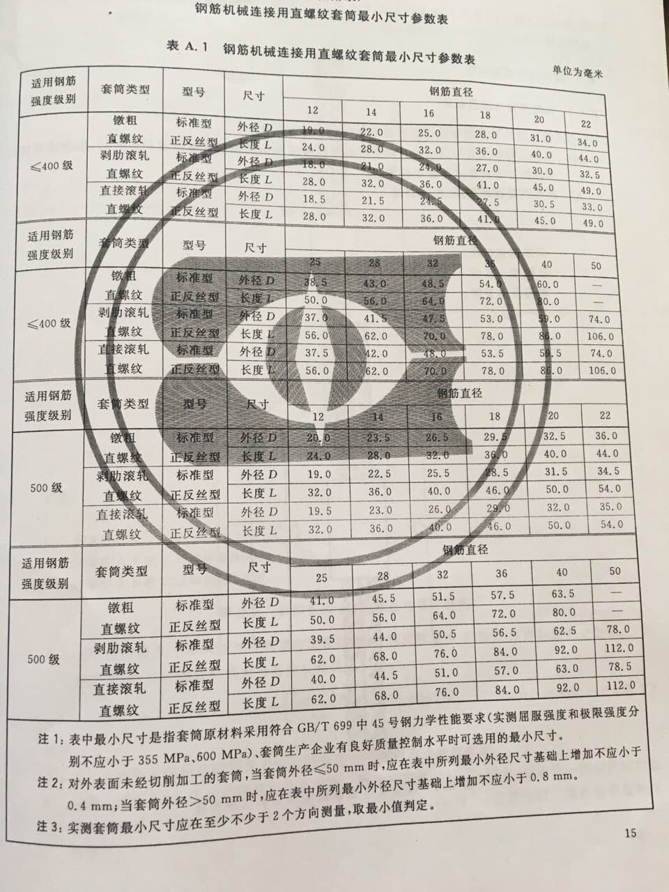 鋼筋連接套筒的長(zhǎng)度和外徑,一直以來(lái)是一個(gè)爭(zhēng)論的問(wèn)題,國(guó)家對(duì)于鋼筋連接套筒長(zhǎng)度和外徑,沒(méi)有統(tǒng)一的規(guī)定,JGJ107-2016《鋼筋機(jī)械連接技術(shù)規(guī)程》,其中關(guān)于長(zhǎng)度和外徑的規(guī)定,也只是一個(gè)低的標(biāo)準(zhǔn),只要不低于這個(gè)標(biāo)準(zhǔn),鋼筋連接試?yán)蛻?yīng)該能通過(guò),但是往往工地上工人鋼筋套絲不是很標(biāo)準(zhǔn),所以,建議工程上在采購(gòu)鋼筋套筒時(shí),要高于技術(shù)規(guī)程中的標(biāo)準(zhǔn)。